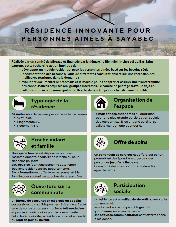 Réponse du comité : À Sayabec et dans les environs, la fermeture de plusieurs résidences pour aînés a mis en évidence un problème majeur : des personnes en perte d’autonomie devaient quitter leur milieu de vie et s’éloigner de leurs proches. Pour répondre à cette situation, le CISSS du Bas-Saint-Laurent et la Municipalité de Sayabec, en s'associant à des partenaires ont choisi de réaliser un projet dans le cadre de la démarche Bien vieillir chez soi. Leur objectif : développer une résidence innovante, adaptée à la réalité locale, qui permette aux aîné·es de rester dans leur communauté, entouré·es des gens qu’ils aiment.