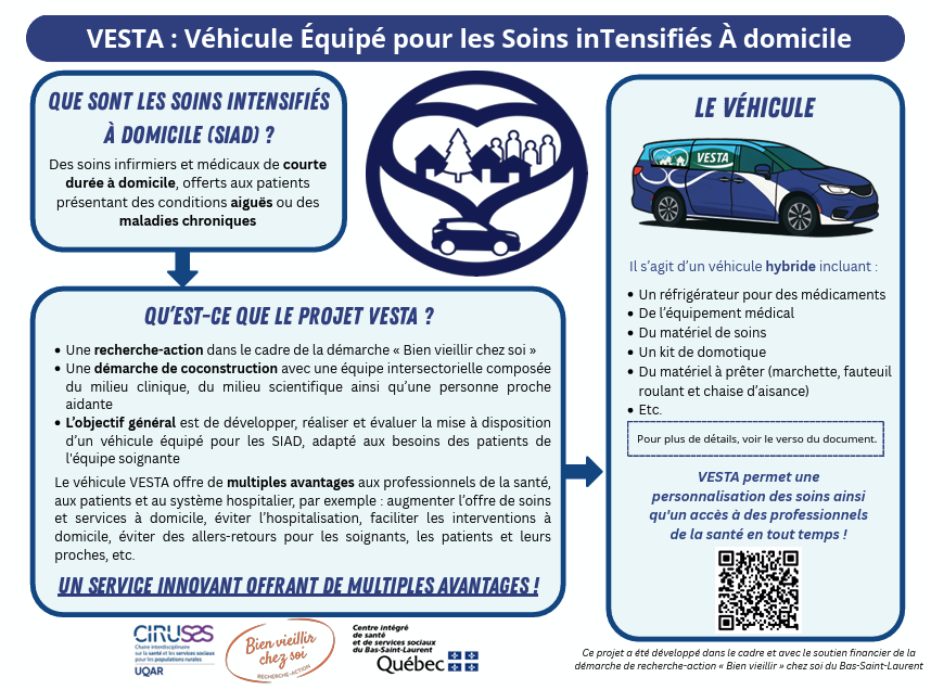 L’objectif général de cette recherche-action est de développer, réaliser et évaluer la mise à disposition d’un camion équipé pour les intervenant·es du SIAD dans la MRC de Rivière-du-Loup afin de faciliter leur travail en contexte de RRPV et d’augmenter le panier de soins et services offerts à domicile, qui autrement auraient lieu en centre hospitalier.